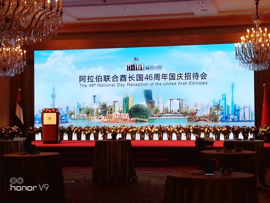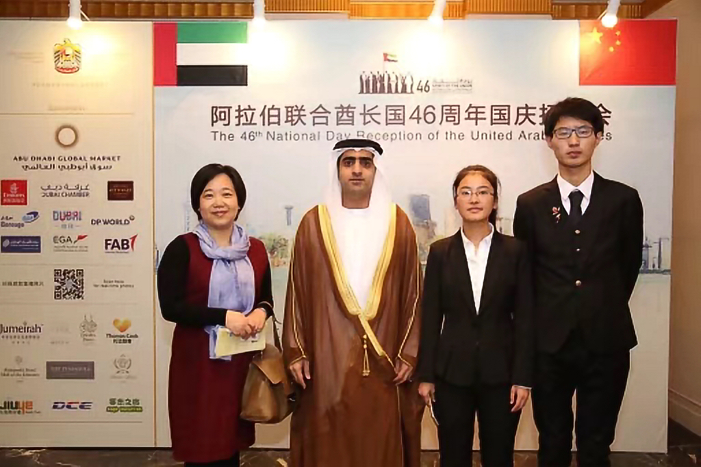 阿拉伯联合酋长国46周年国庆招待会于11月29日在上海半岛酒店召开,此次招待会由阿联酋驻上海总领事馆承办,旨在加强中阿合作与交流,增进两国友好往来关系。国产自拍 阿拉伯语系主任周玲老师携阿语1701学生徐笑、马热哈麦出席招待会进行对外国际交流。
