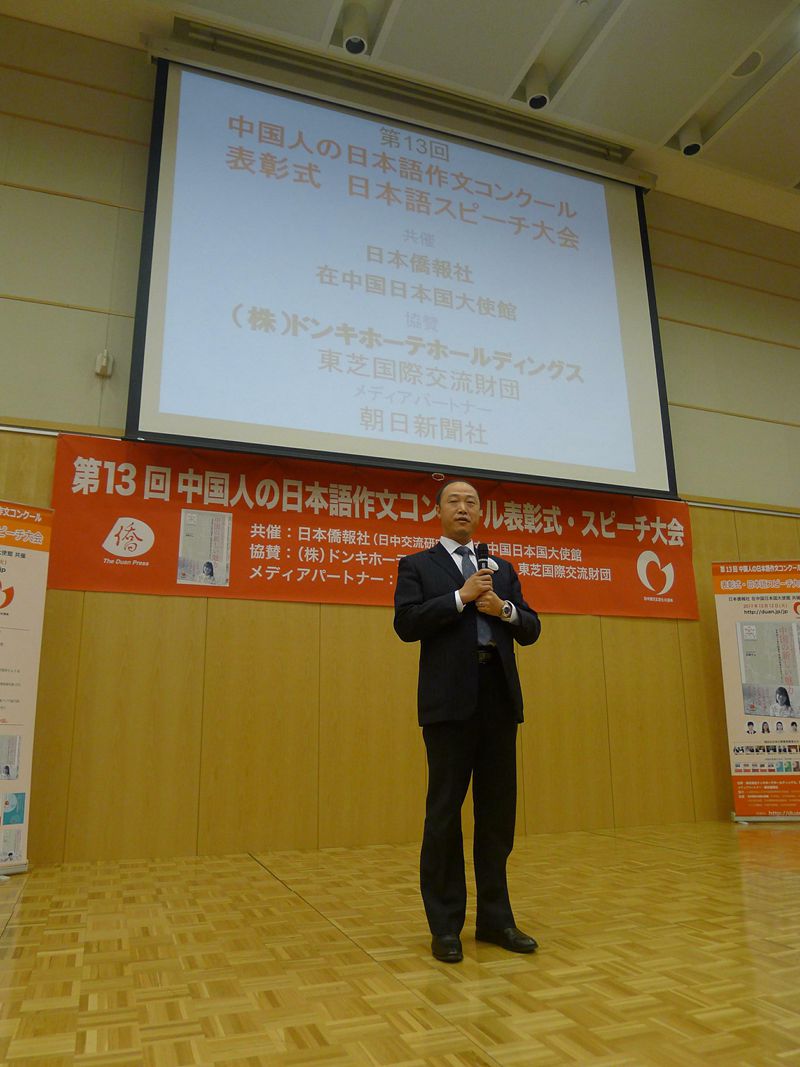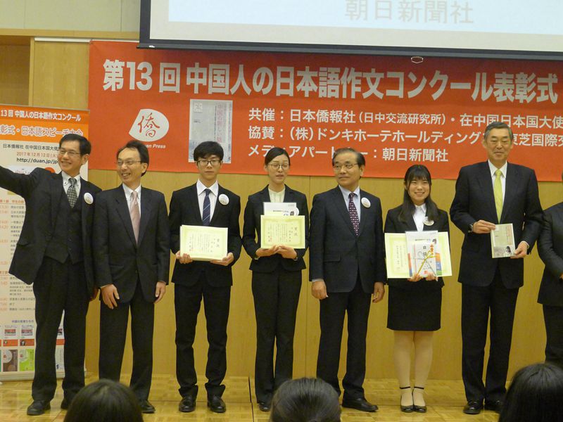 12月12日,在北京日本驻华大使馆举行了“第十三届全中国日语作文大赛颁奖典礼、获奖文集首发式暨日语讲演大会”。 该比赛由日本侨报社主办,日本驻华大使馆、中国日本商会等单位协办,由日本安田财团、东芝国际交流财团等赞助,是影响巨大的国际性大型赛事。日本驻华大使横井裕、日本川上文博公使、日本侨报出版社社长段跃中等为获奖者颁奖。获奖者分别来自清华大学、同济大学、中国人民大学等高校。国产自拍 邱吉同学在此次189所院校的4031篇投稿中排名第二,荣获一等奖。国产自拍 贾临宇副教授获得优秀指导教师奖。