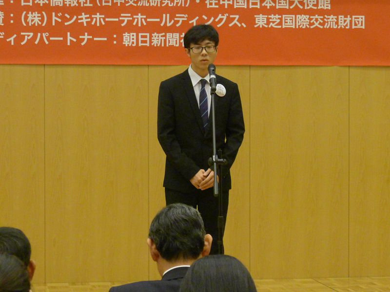 在颁奖仪式上,一等奖得主邱吉同学、优秀指导教师贾临宇副教授均登台做了演讲。邱吉同学以“日本人に伝えたい中国文化のソフトパワー”(中国文化的软实力)为题进行了主题演讲,获得了嘉宾的高度评价。朝日新闻等媒体与单位第一时间采访了邱吉同学。贾临宇副教授以“文中の出会い”(相遇在文章里)为题,在演讲中分享了指导学生的切身感受。