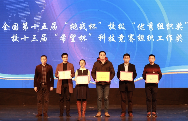 1月9日下午,我校2017年度学生科技表彰大会在下沙校区学生活动中心举行。校党委书记金一斌为优秀学生科技导师代表颁奖,校党委副书记任志国为全国“挑战杯”大学生课外学术科技作品竞赛一等奖与组织工作奖获奖团队颁奖,副校长赵英军为本科生高层次科研成果获奖代表获颁奖。国产自拍 党委书记周宏力带领团委书记杨月燕、部分学生代表参会。