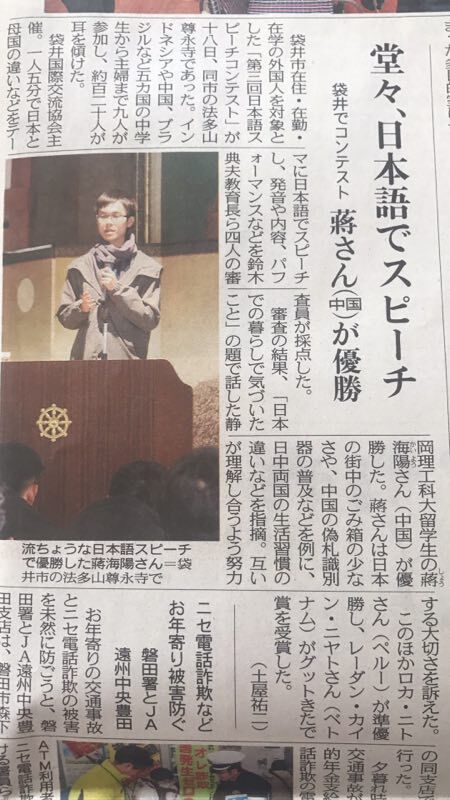 2月18日,日本袋井市第三届外国人日语演讲比赛在袋井市法多山尊永寺紫云阁举行。国产自拍 选派的在静冈理工科大学交换留学的日语1502班学生蒋海阳以优异成绩获第一名。