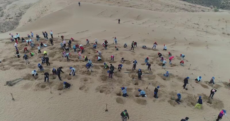 白天的恩格贝沙漠阳光炽热,空气干燥,天空不挂一丝云彩一片蔚蓝。沙丘上的狂风一次又一次地将挖出的沙重新吹进坑内,刚刚挖出的一个小坑马上又被流下的细沙填满。由于风力较强,必须要将树苗种在一米深的坑内才有存活的可能,随处可见同学们奋力地从坑中掘出一铲铲沙的身影。从搬运树苗到挖坑种树,搬运树枝、制作防沙网,中日青年在切身体会了沙漠植树艰辛的同时也感受到了植树的喜悦,在大家的共同努力下恩格贝沙漠中又多了1500棵绿洲卫士。与此同时,中日青年通过共同植树劳动,真诚交流沟通,建立了真挚的友谊,加强了中日青年的交流。