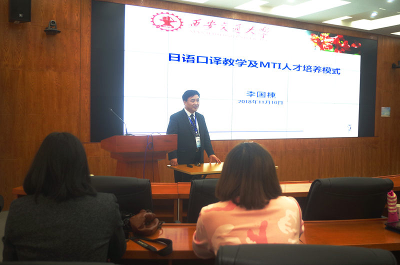 李国栋教授以西安交大日语翻译硕士为例,围绕日语口译教学的课堂组织,日语口译的难点及技巧,MTI人才培养模式,突出特色、提高质量、服务要求这四点展开演讲。