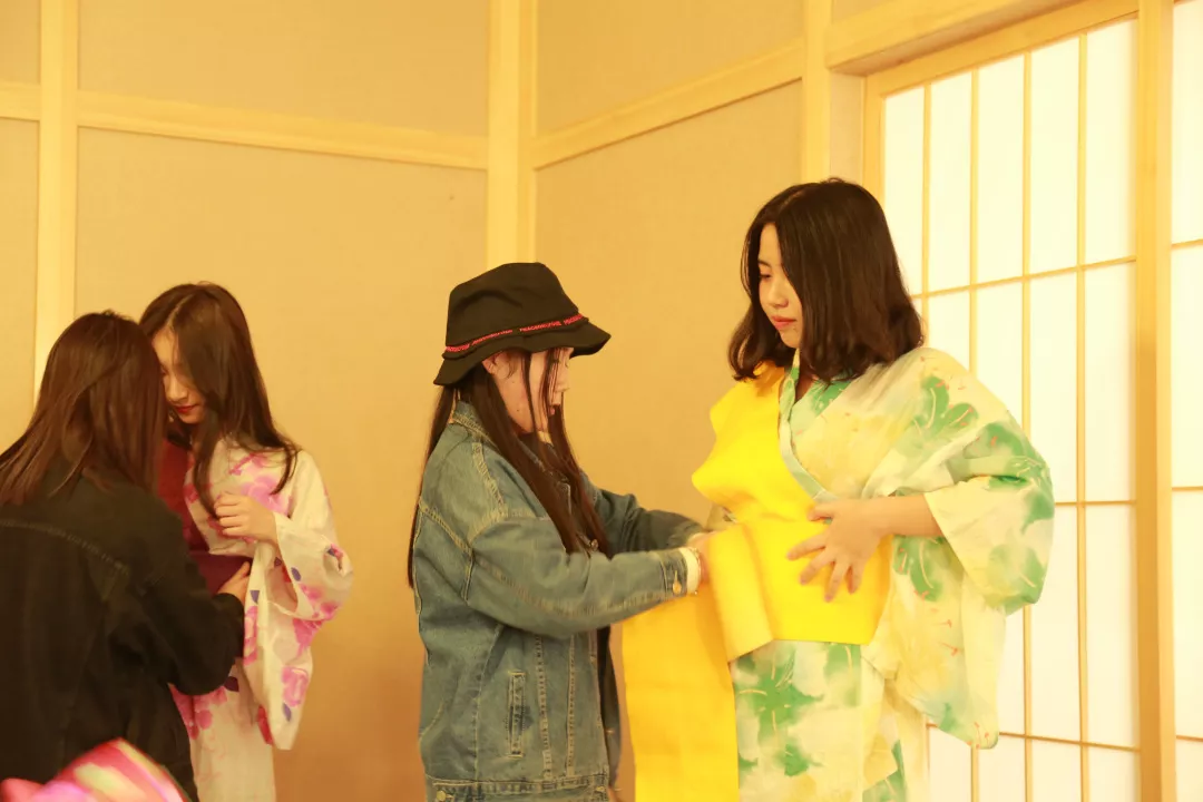 在了解了和服和浴衣的基本常识后,热情的志愿者们帮助同学们试穿了浴衣,让大家感受到了日本文化的魅力。