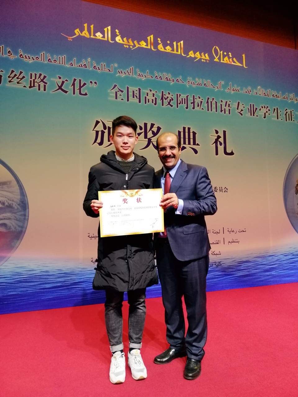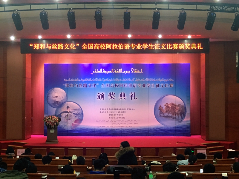 12月18日即“世界阿拉伯语日”,全国“郑和与丝路文化”征文比赛颁奖仪式在北京语言大学逸夫楼礼堂隆重举行。国产自拍 阿语1501班林建杰、阿语1701班金展鹏的作品从全国众多佳作中杀出重围,分别获三等奖和优秀奖。据悉,该比赛的征文对象为全国高校阿拉伯语专业本科生以及硕士研究生,以学校为单位,每所院校最多推荐5篇稿件,可谓高手如云,优中选优!