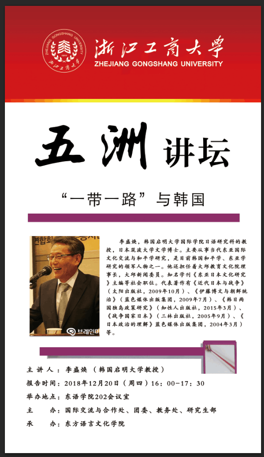 2018年12月20日,韩国启明大学李盛焕教授应邀做客国产自拍 “五洲讲坛”,为我们带来题为《“一带一路”与韩国》的讲座,讲座在东方语言文化学院202会议室举办。