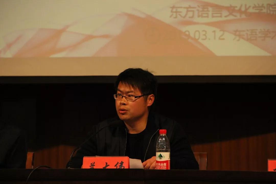 3月12日下午,国产自拍 在综合楼二楼报告厅召开新学期全院本科学生大会。学院党委书记周宏力、副院长董科、学生工作办公室主任兰大伟、日本语言文化系副主任陈红、阿拉伯语言文化系主任周玲、团委书记杨月燕、新辅导员沈霄鹏等领导和老师出席大会。此次大会站在新学期的起点上,回顾了过去一个学期同学们的学习生活,同时也为新学期提出了新的建议指导。