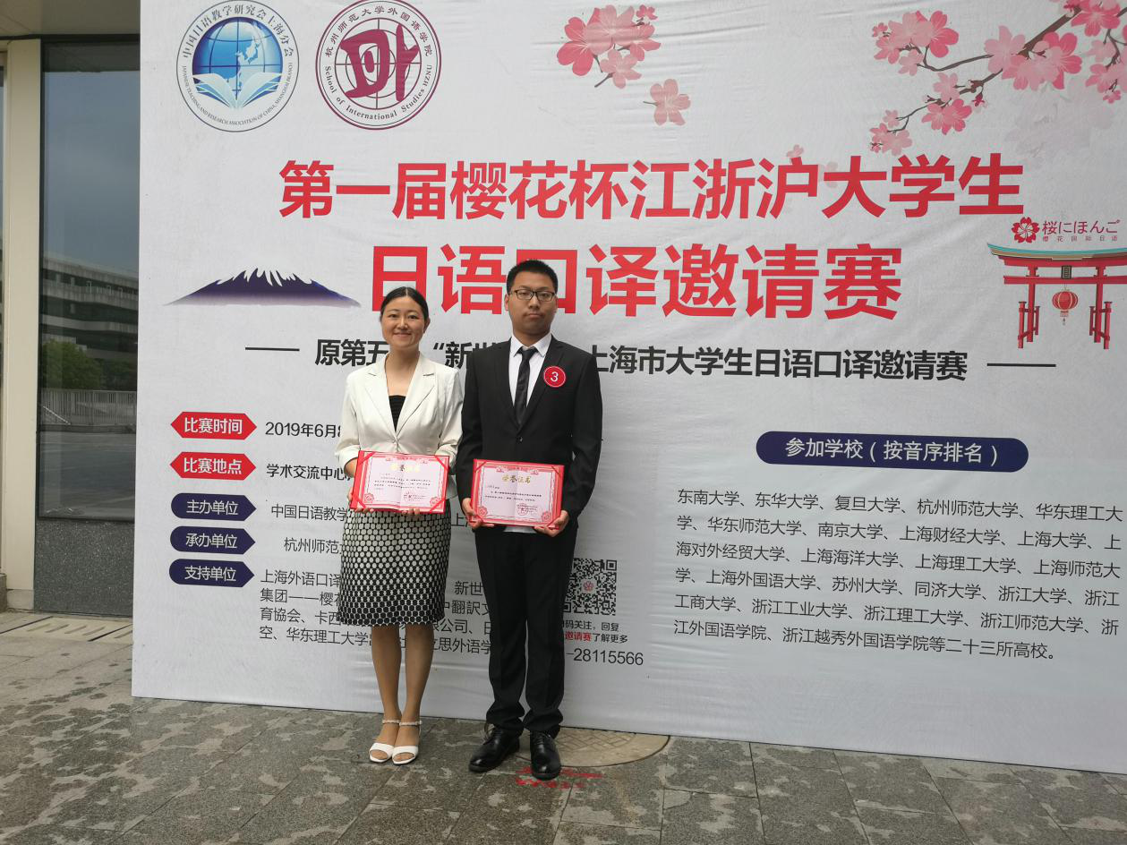 6月8日,第一届“樱花杯”江浙沪大学生日语口译邀请赛暨原第五届“新世界杯”上海市大学生日语口译邀请赛在杭州师范大学举行。国产自拍 日语笔译(翻译硕士)18级研究生江雨寒星同学代表我校参加了本次比赛,经过激烈的角逐荣获三等奖,并获得了上海中级口译证书,江雨寒星的指导老师吴玲教授获优秀指导老师。