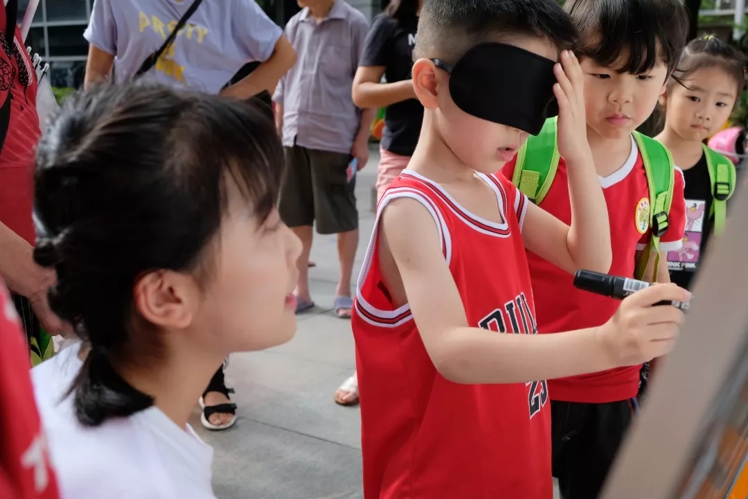 因为本次宣讲面向的对象主要是孩子们,为了寓教于乐,让孩子们可以更好地感受盲童的世界,我们开展了2个小游戏。第一个游戏是白板画画。小朋友戴上眼罩,为面前有一定距离的白板上所画的脸添上鼻子。此项活动让孩子们感受到了在黑暗的环境下,盲童所不得不面对的不便。