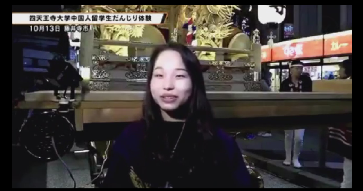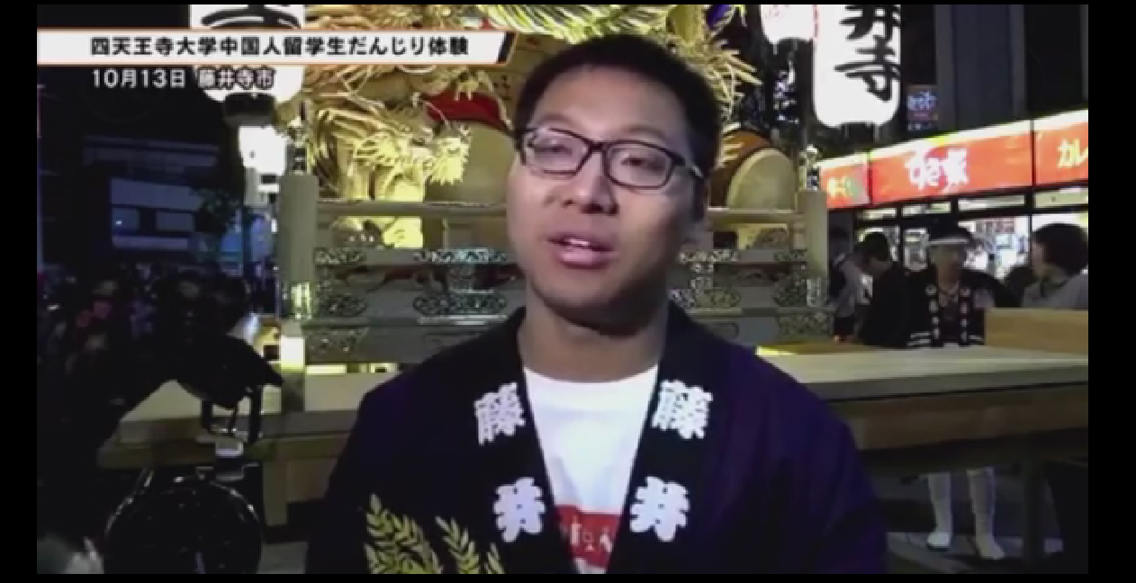 10月13日,日本第19号台风过境的次日,竟意外地晴空万里,仿佛也在期待日本传统彩车祭典(だんじり祭り)的召开。受到藤井寺彩车组织协会的邀请,国产自拍 在日本大阪市留学的14名学生与日本四天王寺大学的师生们穿着号衣一起参与了此次盛大祭典。据大阪电视台Jcom频道报道,大阪市长在表演开始前对我校及国产自拍 留学学生进行专门介绍。