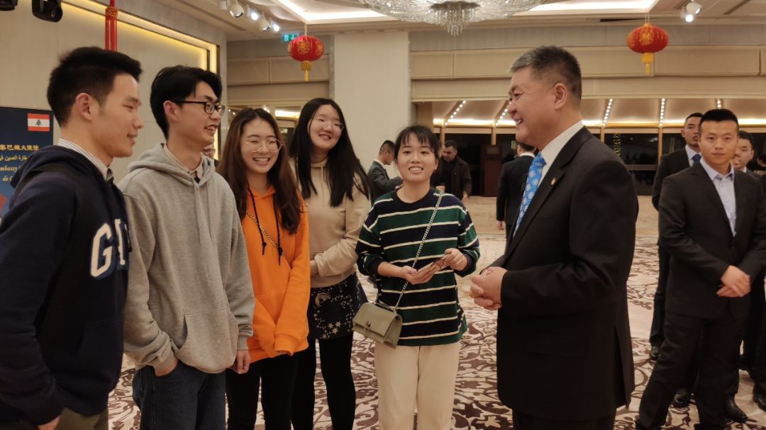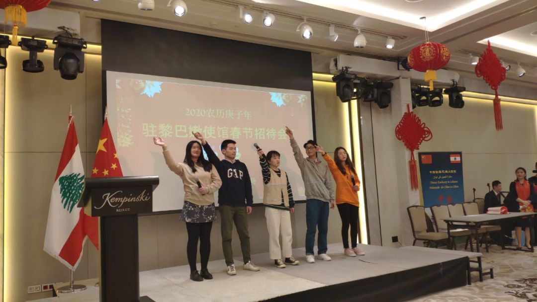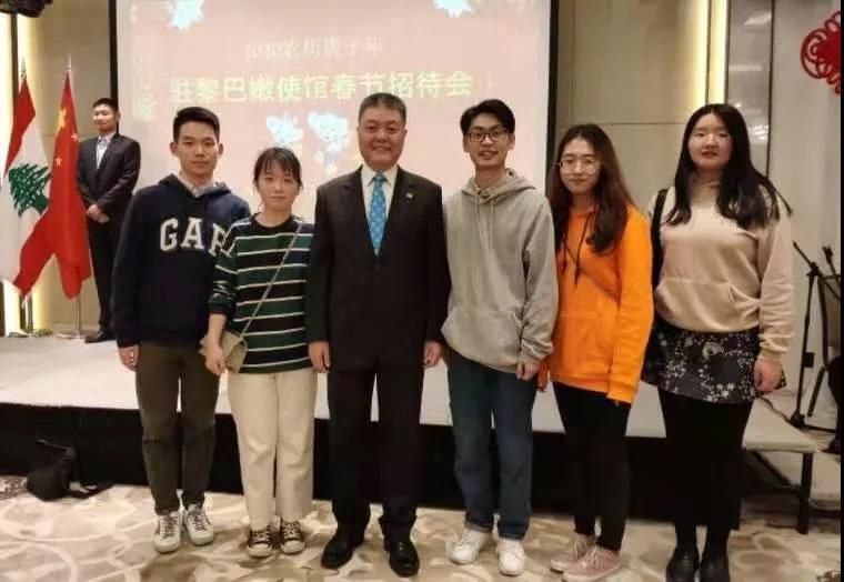 1月21日,我国驻黎巴嫩大使馆举行2020年春节招待会,在黎中资机构代表及教师、留学生、维和官兵、华侨华人和家属等约300人欢聚一堂,共贺新春。我院阿拉伯语言文化系在黎巴嫩大学留学的五位学生受邀参加此次招待会,他们分别是阿语1701班王紫珊、周萱、林海雪、杨鹏辉、金展鹏。