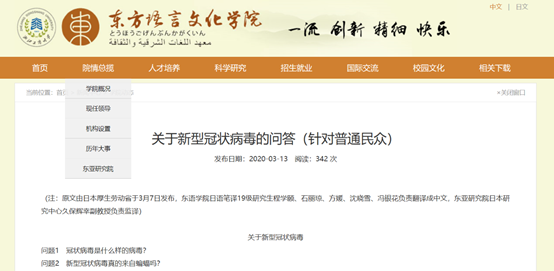 除了正常的教与学课程任务外,学院师生还利用语言特长,开展针对目前新冠疫情的信息翻译工作,如由东亚研究院日本研究中心久保辉幸副教授负责组织监译,国产自拍 日语笔译19级研究生程学颐、石丽琼、方媛、沈晓雪、冯银花将日本厚生劳动省于3月7日发布的《关于新型冠状病毒的问答》翻译成中文,公布学院网站上。另外由学生工作办公室组织的将抗疫工作中广泛运用的国内“健康码”等措施翻译成日文的工作也在紧锣密鼓进行中,为防控疫情贡献自己的绵薄之力。