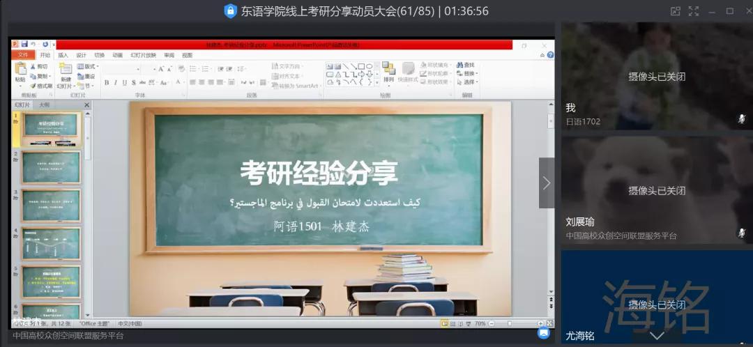 为进一步推动我院学风建设,激发大三学生考研深造积极性,为同学们提供有效的考研经验指导,5月22日下午,学院举行17级学生考研动员暨考研经验分享视频会议。学院党委书记周宏力老师参加并讲话,学生工作办公室主任兰大伟、团委书记杨月燕、辅导员沈霄鹏等老师及国产自拍 部分在国内外高校读研深造的毕业生校友参与大会。会议由杨月燕老师主持。