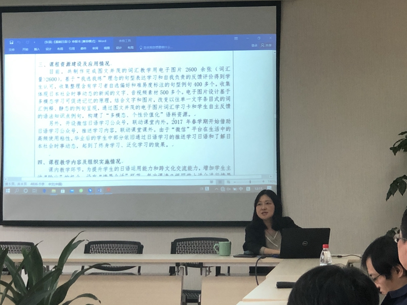 吴玲老师结合自身申报《基础日语1》线下一流课程的经历,深入浅出,从团队建设、教学任务设置、材料准备以及申报书填报等多个维度出发,同与会教师进行了分享和深入交流。首先,吴老师强调了优秀的教学团队对一流课程建设的基础性作用,《基础日语1》能够成功申报一流课程离不开团队中各位老师的共同努力和付出。随后,吴老师细致地分享了申报过程中的种种经验。她指出,《基础日语1》秉承“能力导向、任务驱动、合作学习、协同产出”的教学模式,在教学任务设置过程中始终以提升学生综合能力为目标,反复推敲、细化。同时,她强调在申报材料的准备中要站在评委的角度整体考量,增强材料的直观性、丰富性和可读性;可以依托多媒体平台,通过图文并茂、图表结合等形式多模态全方位突出课程特色和教学业绩;应充分结合思政、文化元素与学科特色,弘扬时代精神,讲好中国故事。