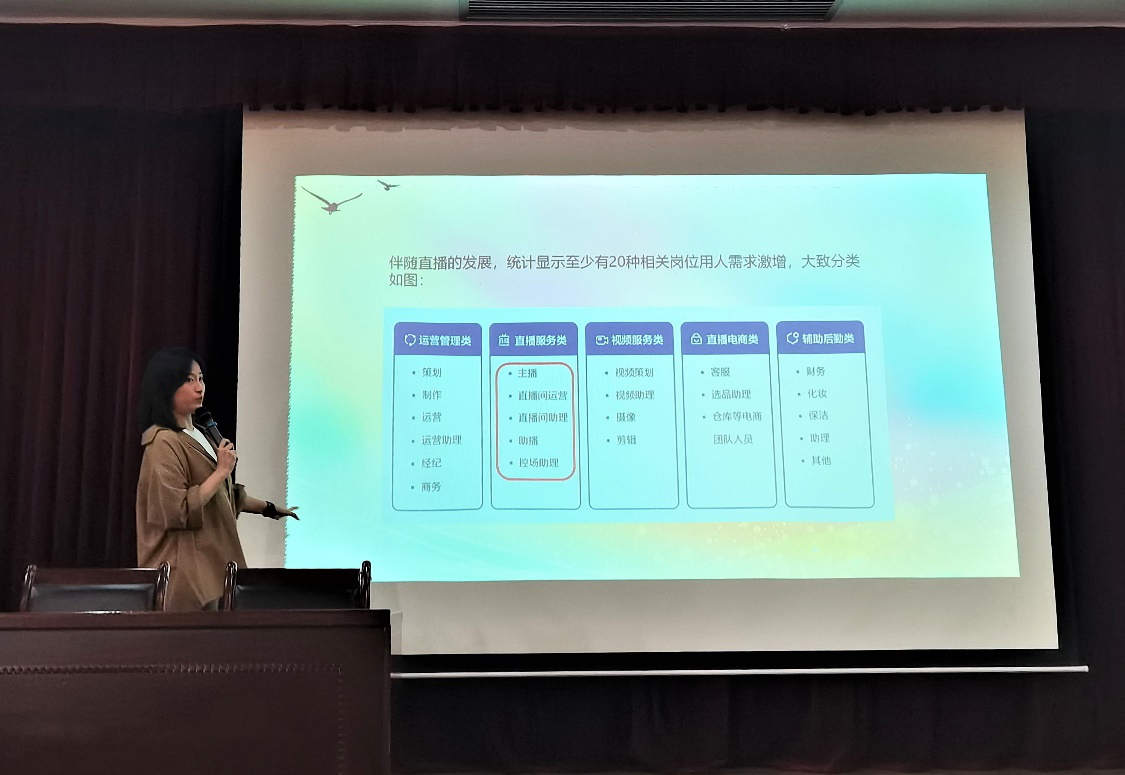 杨渔樵校友为同学们详细介绍了圆周率公司的发展情况,向同学们简单分享了他毕业后的就业困境、早期创业经验以及如何从困境中找到适合自己的职业等历程。随后,圆周率大学副校长刘晓琛以幽默风趣的的演讲方式向同学们分享了当前直播行业现状,行业环境分析,优质就业解决方法等。互动环节,同学们对直播带货兴趣盎然,纷纷积极踊跃提问。