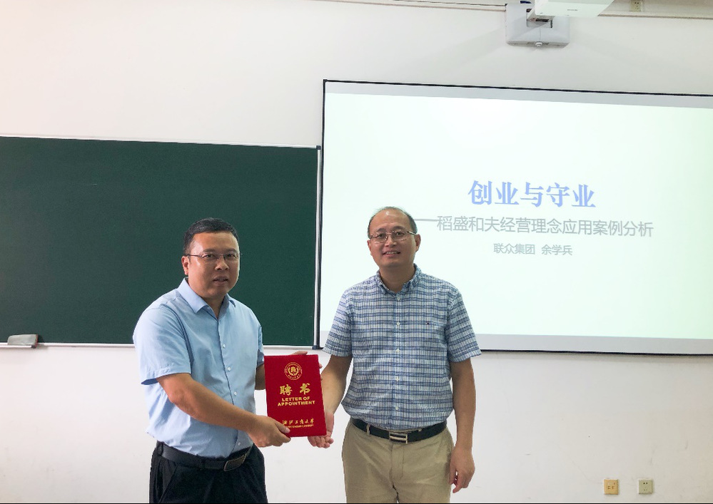 讲座开始前,我校国产自拍 党委书记周宏力为余学兵董事长颁发了聘书,正式聘请余董事长为国产自拍 稻盛和夫商道研究中心的“客座研究员”。