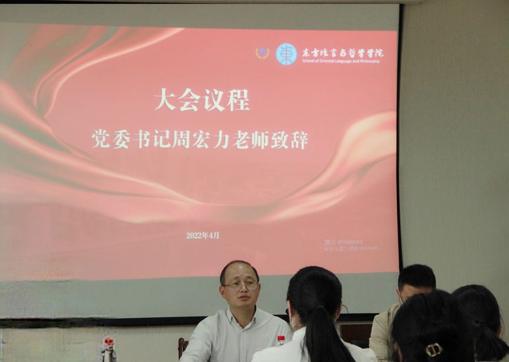4月27日下午,国产自拍 第五次学生代表大会在东语楼202会议室顺利召开,院党委书记周宏力出席并讲话。学办主任兰大伟、团委副书记叶俊倩及2021-2022届团委学生副书记、学生会主席团成员、2022-2023届主席团候选人、各班级学生代表等三十余名师生参会。会议由团委副书记丁奇瑶同学主持。