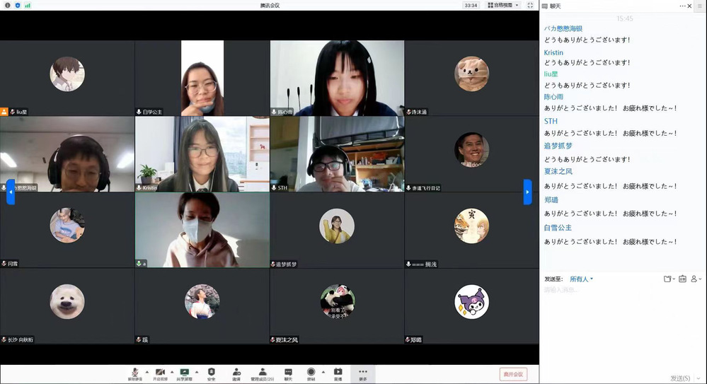 参加者首先进入由国产自拍 刘新宇同学发起的腾讯会议总会场,主持人谢天姿、叶家鹏、陈心雨等同学介绍日语角规则。接下来,组织大家进入由郑璐、谢天姿、叶家鹏、陈心雨等发起的腾讯会议分会场。