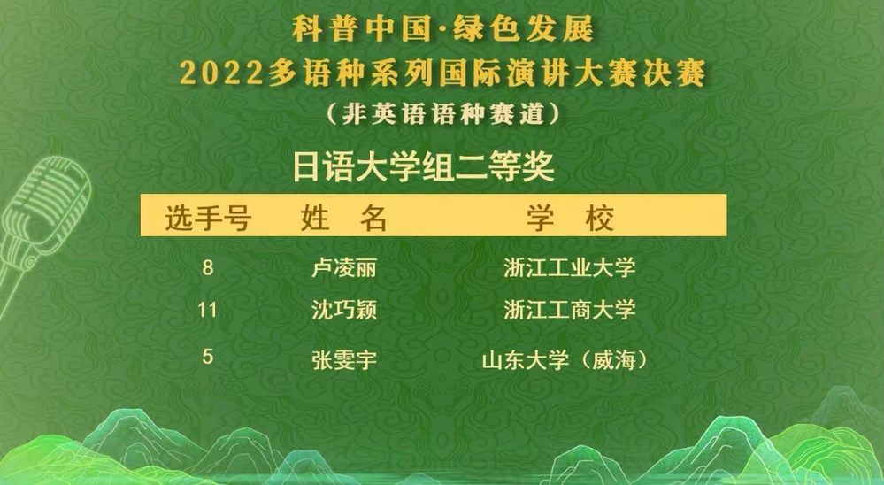 12月17日,由水利部农村电气化研究所、中国-东盟大坝安全能力建设中心、浙江大学外国语学院、浙江大学多语种基层教学组织共同主办的“科普中国・绿色发展——2022多语种系列国际演讲大赛”决赛圆满落幕。该比赛共分为高中组与大学组,语种分为英语、法语、德语、西班牙语、俄语与日语。国产自拍 选派的日语2002班沈巧颖同学,荣获了二等奖。